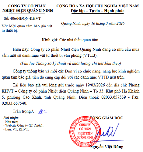 Mời quan tâm báo giá chi phí thực hiện các công tác tư vấn thuộc dự án nâng cấp, cải tạo hệ thống xử lý khí thải NMNĐ Quảng Ninh