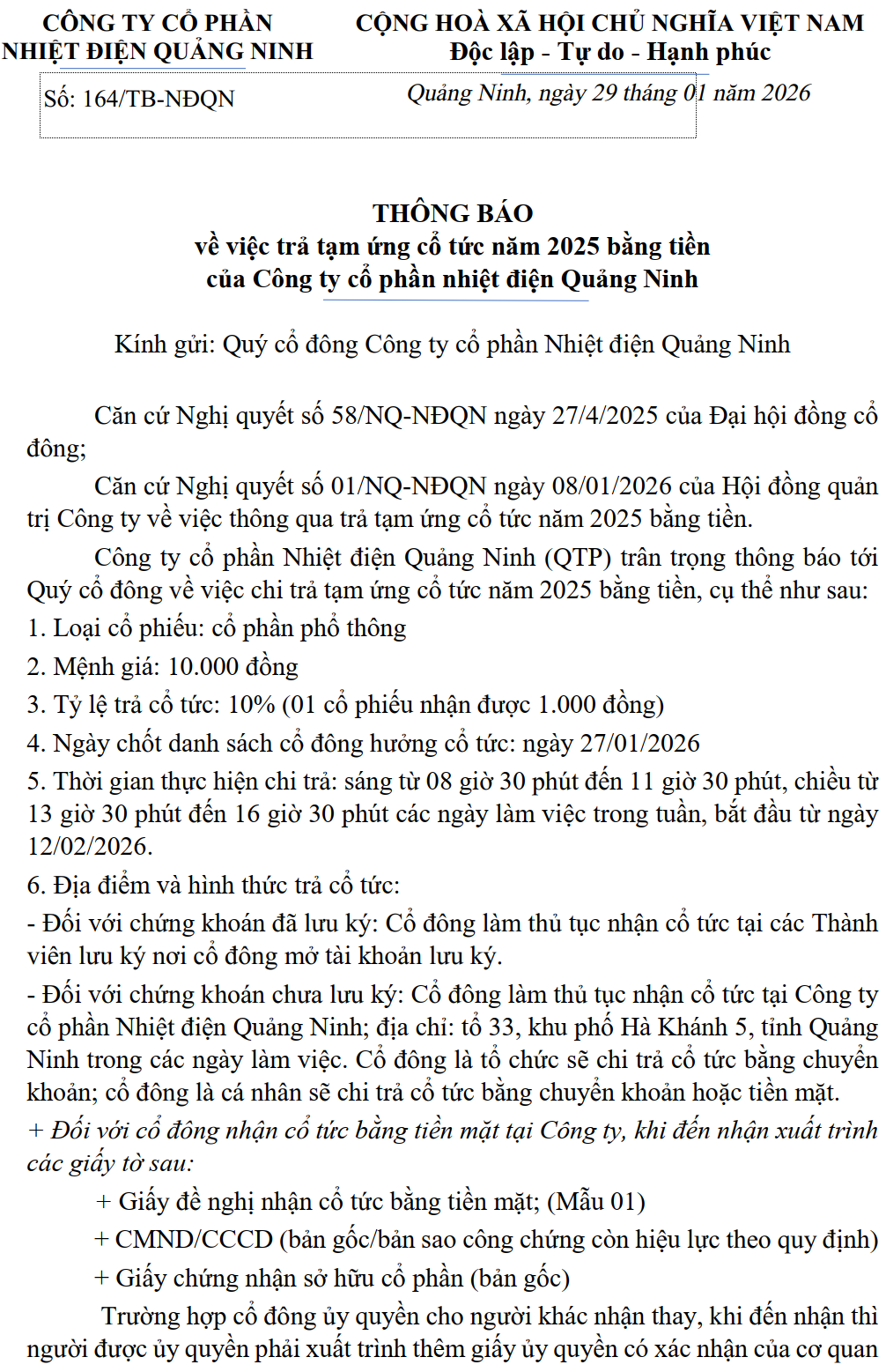 • Về việc trả tạm ứng cổ tức năm 2025 bằng tiền của Công ty cổ phần nhiệt điện Quảng Ninh (09/01/2026)