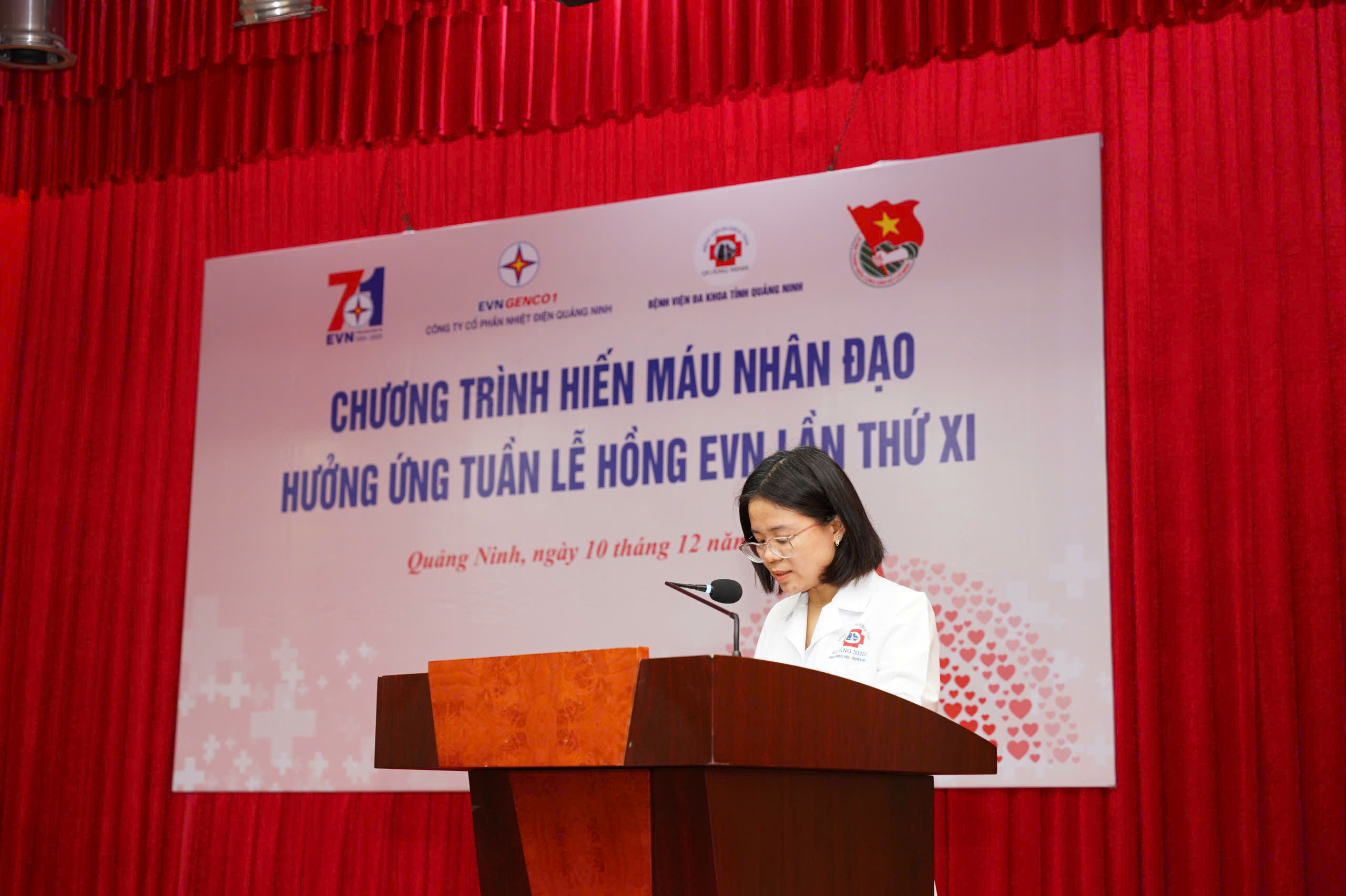Đại diện Bệnh việt đa khoa tỉnh Quảng Ninh đồng chí Trần Thị Thanh Loan - Phó khoa huyết học bệnh viện đa khoa tỉnh Quảng Ninh cho biết toàn bộ lượng máu thu nhận từ chương trình sẽ được đưa vào ngân hàng máu dự trữ, phục vụ cấp cứu và điều trị tại các bệnh viện trong khu vực. Đồng thời tại chương trình đồng chí cám ơn toàn thể CBCNV trong Công ty đã nhiệt tình tham gia chương trình và gửi gắm niềm tin rằng mỗi giọt máu hiến tặng hôm nay sẽ góp phần giúp bệnh nhân sớm hồi phục, trở lại cuộc sống bình thường và tiếp tục lan tỏa những nghĩa cử tốt đẹp đã nhận được.