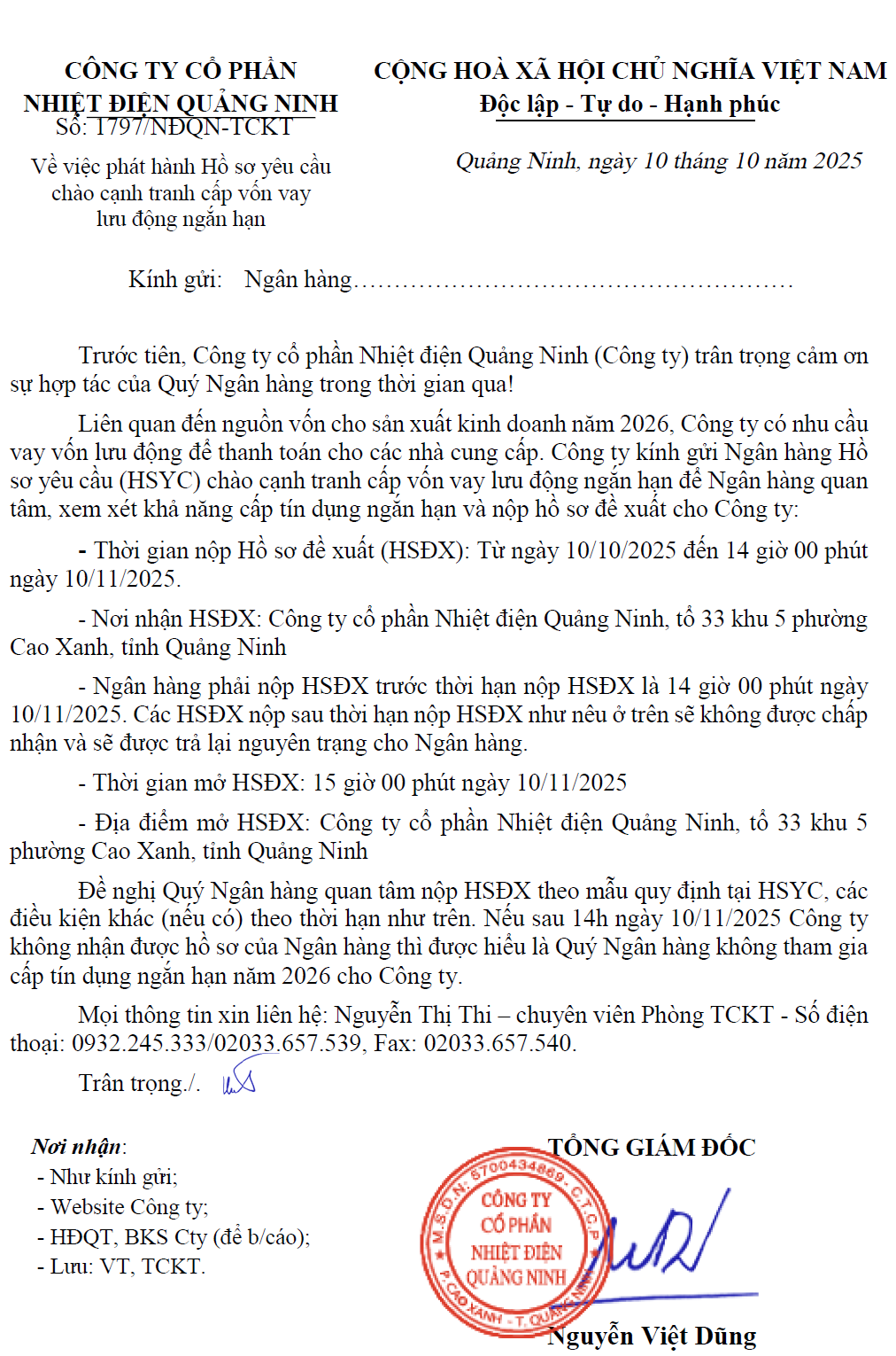 Phát hành Hồ sơ yêu cầu chào cạnh tranh cấp vốn vay lưu động ngắn hạn
