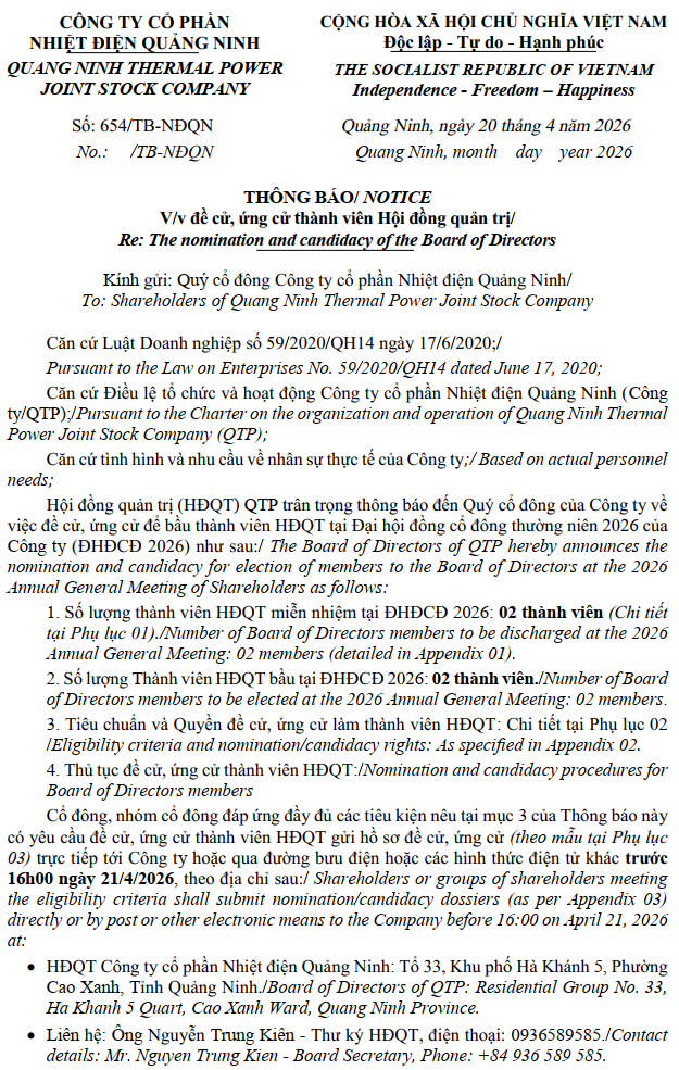 Thông qua kế hoạch tổ chức họp Đại hội đồng cổ đông thường niên 2026 Công ty cổ phần Nhiệt điện Quảng Ninh