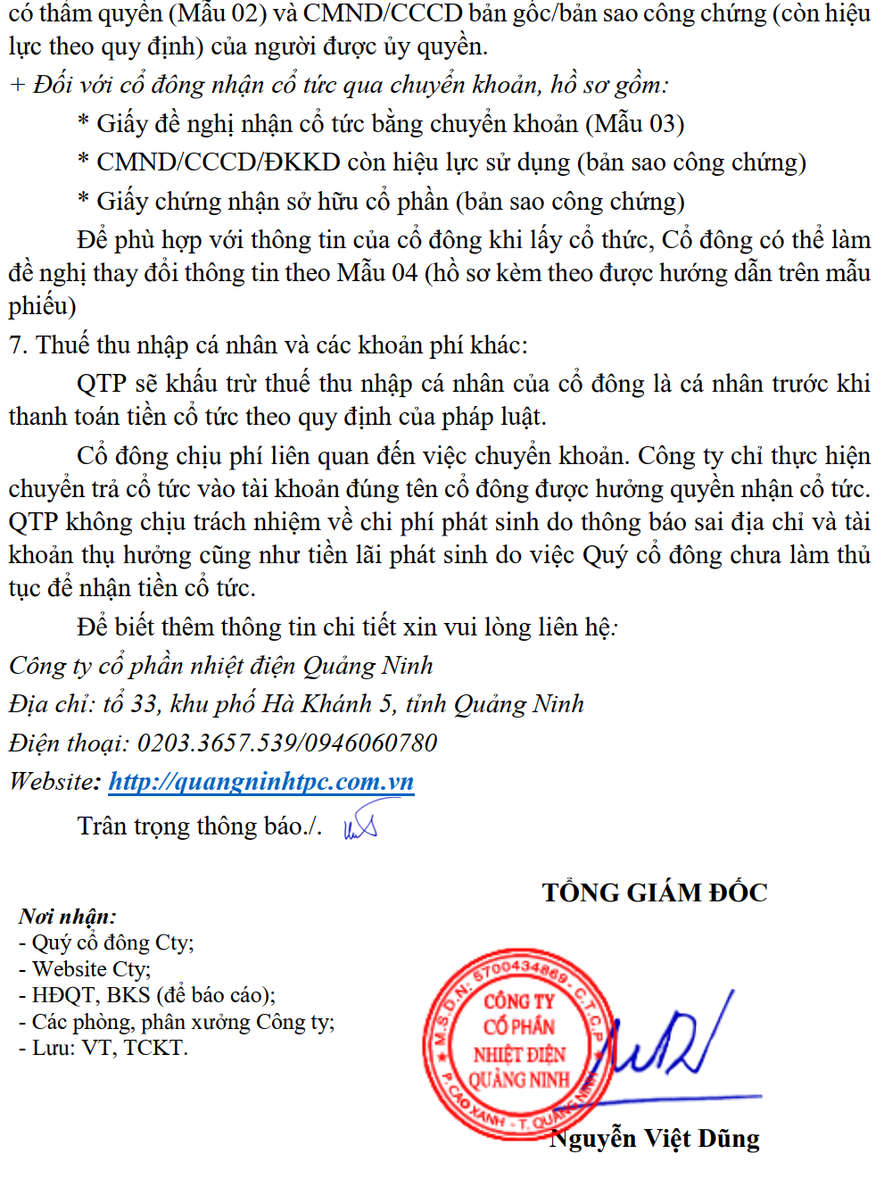 Thông báo về việc trả tạm ứng cổ tức 2025 bằng tiền của Công ty cổ phần Nhiệt điện Quảng Ninh