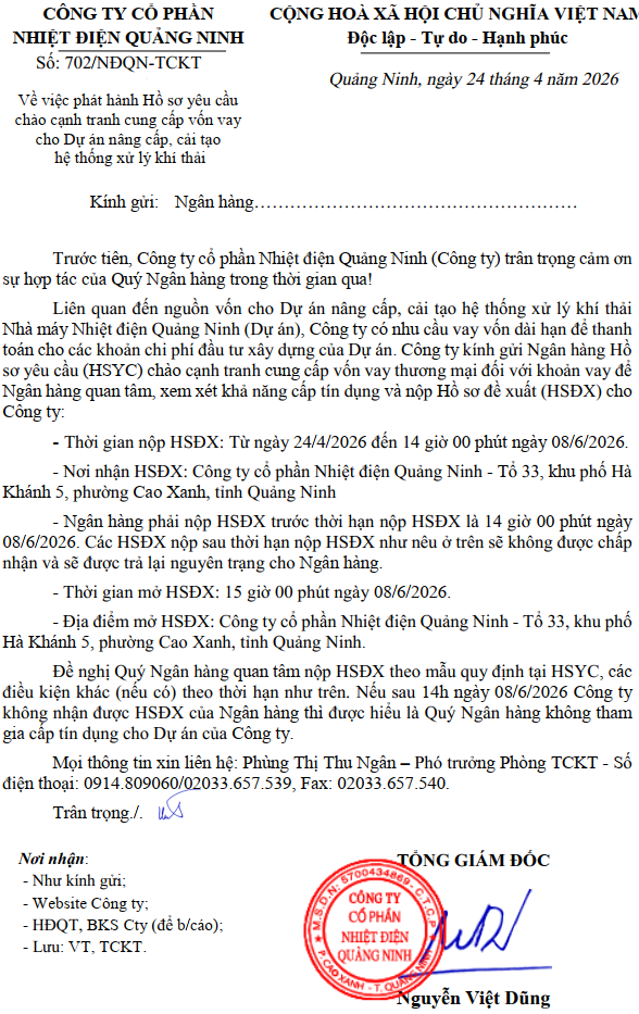 Về việc phát hành Hồ sơ yêu cầu chào cạnh tranh cung cấp vốn vay cho Dự án nâng cấp, cải tạo hệ thống xử lý khí thải